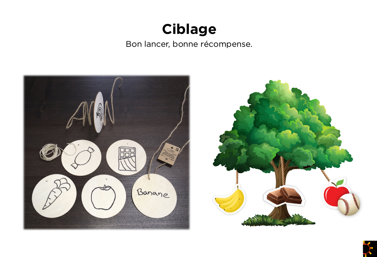 Différents articles, événements ou actions de son choix sont accrochés dans un arbre. Le participant doit tenter d’atteindre les cibles à partir d’un endroit prédéterminé. Ceux d’une plus grande valeur sont mieux protégés. Un nombre de lancé est laissé à votre discrétion. Le participant obtient ce qui est sur la cible atteinte. |
