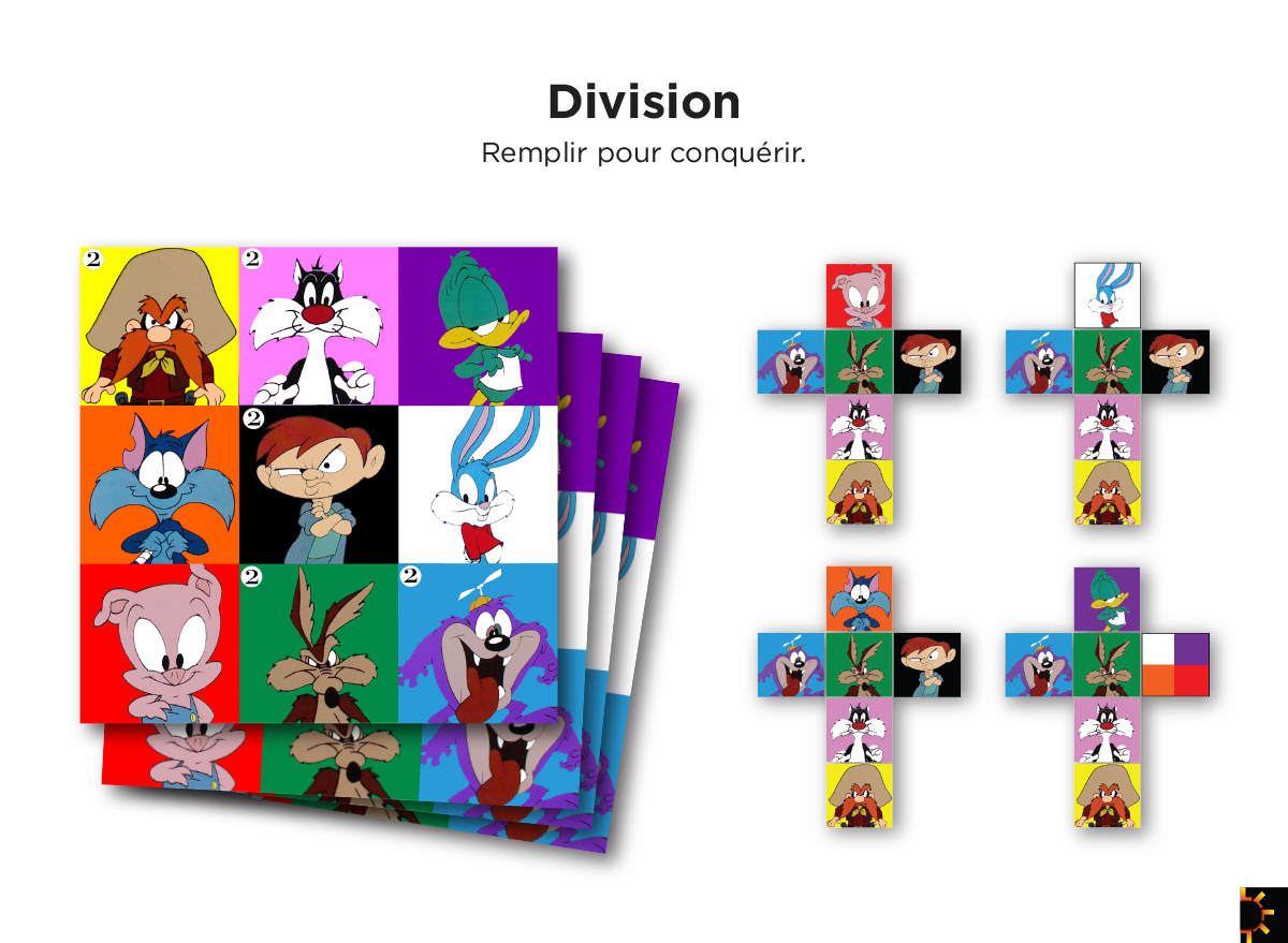 Il suffit simplement de brasser les quatre dés et de remplir les cases. Pour couvrir une case marquée d’un cercle 2, il faut obtenir deux figures identiques dans sa brasse. Le symbole des quatre couleurs signifie que le joueur peut choisir soit le mauve, le blanc, l’orange ou le rouge. Une seule case peut-être remplie par tour. |