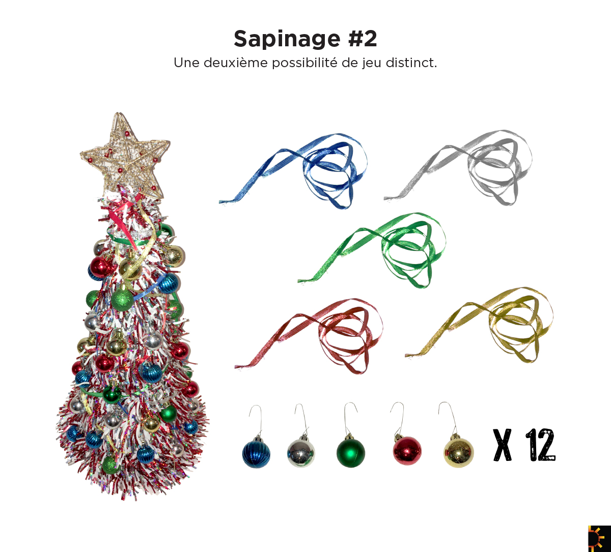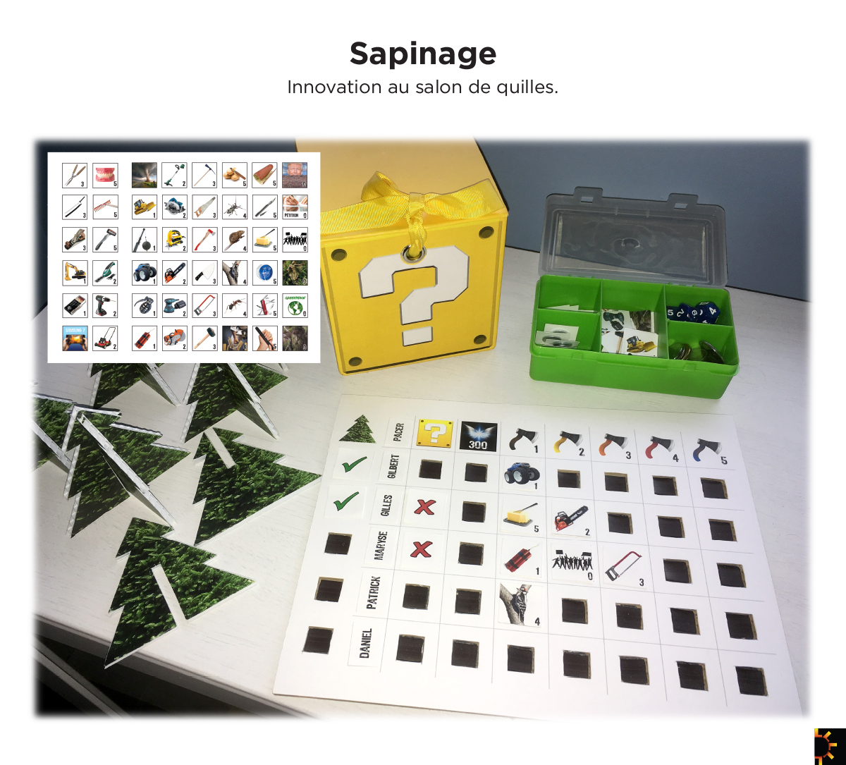 Inspiré par le jeu de plateforme que j’ai mis en œuvre, mon paternel a créé son propre jeu de bowling pour son équipe. Le jeu comprend un sapin, une étoile, cinq rubans et 60 boules de cinq couleurs différentes pour chaque joueur de l’équipe qui est composé de cinq individus.